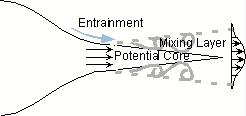 where there are gradients of velocity perpendicular to the velocity direction, there is shear. The mixing layer thickness is approximately 0.2x to 0.25x, where x is the distance downstream of the nozzle exit.