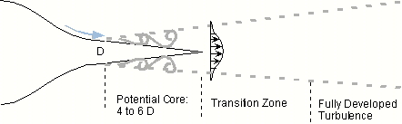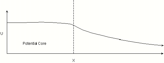 A plot of the velocity component parallel to the axis, along the axis, would look as follows. In the potential core, the velocity can chance if the external pressure changes, as for example, for a jet inside a duct of changing cross-section. Otherwise, there would be no change inside the potential core. Beyond the potential core, the jet slows down through mixing and momentum exchange with the outside flow: the influence of the jet spreads outwards, while the influence of the outside is felt at the axis.