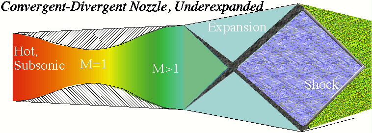 Shown below is an underexpanded supersonic jet, coming out of a convergent-divergent nozzle. As the jet comes out of the exit, it expands because the outside pressure is less than the nozzle exit pressure. The flow at the edge turns, sending out Prandtl-Meyer expansion waves. Beyond this, the “slip line” bordering the jet flow is a line across which the velocity changes sharply, but the static pressure is the same. This “slip line” is where the shear layer develops. At the axis (or plane of symmetry if its a 2-D planar jet), more P-M expansions go outward as the flow expands further. When these expansion waves reach the outer boundary, the pressure becomes lower than the outside, forcing the flow to turn back in so that the pressure stays unchanged across the slip line. This inward turn and pressure rise occurs across an oblique shock. This process continues until a normal shock occurs and the flow becomes completely subsonic, spreads out and slows down.