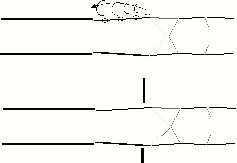 Here we are interested in how the screech occurs in the jet outside the nozzle exit, and how it can be cured. Note that the jet is supersonic: no information can propagate upstream, so how can there be any feedback? The answer is that the flow is not supersonic everywhere in the shear layer, or outside the jet. As we saw in the Cavity Flow case, there is a forward propagation path, and a feedback path, and these are in different portions of the flow. The forward propagation of disturbances is through the generation of vortical structures (amplified instability waves) in the shear layer. These move at (you can guess!), about 0.65 times the jet flow velocity. When the vortical structure hits a shock, there is a large pressure disturbance. It is debatable whether this is due to fluctuation of the shock, or distortion of the vortical structure, or both. At any rate, the pressure disturbances propagate as sound waves. They can move upstream through the subsonic part of the shear layer, and through the outside flow (assuming that the outside flow is not supersonic too). When these pressure fluctuations reach the nozzle lip (edge of the nozzle exit), they “excite” the shear layer, and trigger the rollup of new structures, which sail off downstream again. This completes the loop.
