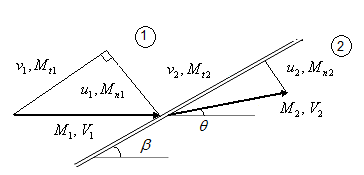 \[ \begin{aligned} M_{n,1} &= M_{1} \sin{\beta} \\ M_{n, 2}^{2} &= \frac{1+[(\gamma-1) / 2] M_{n, 1}^{2}}{\gamma M_{n, 1}^{2}-(\gamma-1) / 2} \\ \frac{\rho_{2}}{\rho_{1}} &=\frac{(\gamma+1) M_{n, 1}^{2}}{2+(\gamma-1) M_{n, 1}^{2}} \\ \frac{p_{2}}{p_{1}} &= 1+\frac{2 \gamma}{\gamma+1}\left(M_{n, 1}^{2}-1\right) \\ \frac{T_{2}}{T_{1}} &= \frac{p_{2}}{p_{1}} \frac{\rho_{1}}{\rho_{2}} \\ \tan{\theta} &= 2 \cot{(\beta)} \frac{M_{1}^{2} \sin^{2}{(\beta)}-1}{M_{1}^{2}(\gamma+\cos{(2 \beta)})+2} \\ M_{2} &= \frac{M_{n, 2}}{\sin{(\beta-\theta)}} \\ \end{aligned} \]